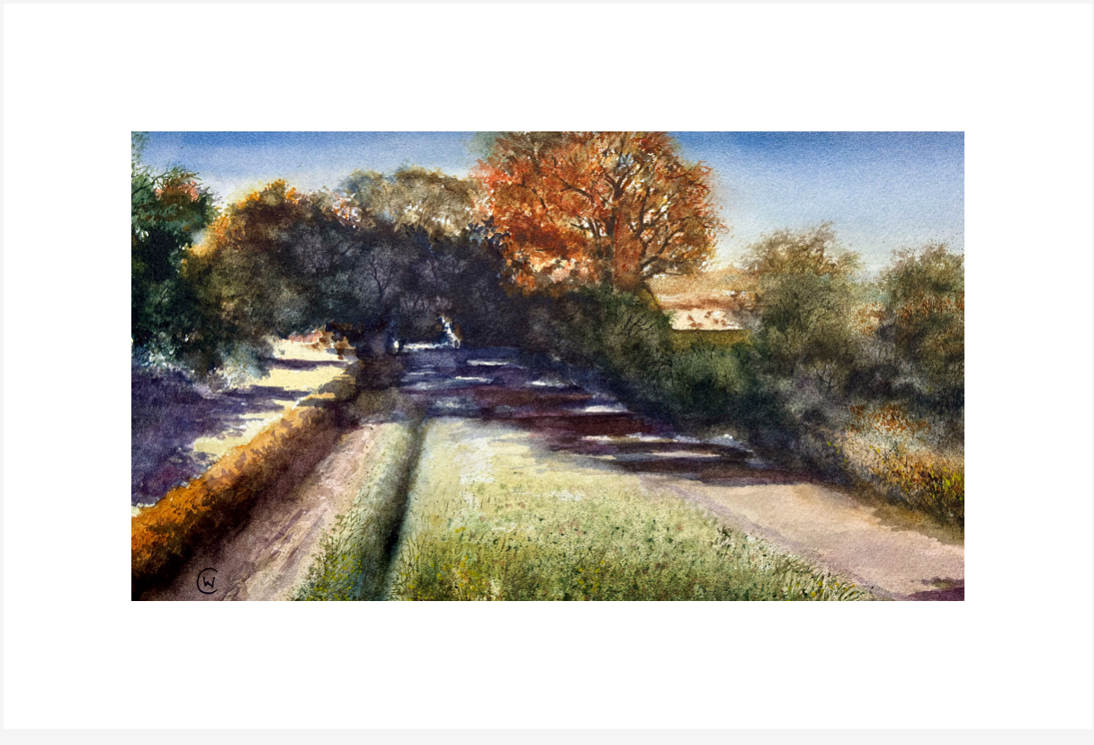 A country track and a narrow road converge before vanishing beneath the trees. Beyond them, the fields stretch into quiet distance, held in the soft light of late afternoon. It’s a landscape of stillness and remembrance — a moment where time seems to pause, and all things drift gently away.